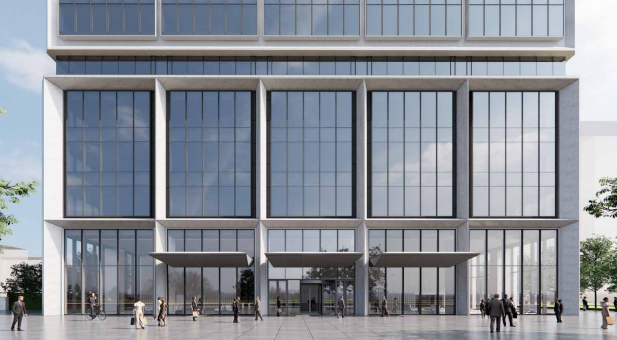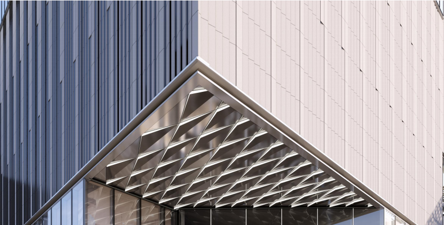 写字楼立面,借鉴南京民国建筑的格局纹理,追溯经典,保留民国建筑的特征,采用秩序格网作为构图元素,整体气质端庄典雅。