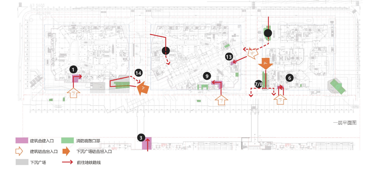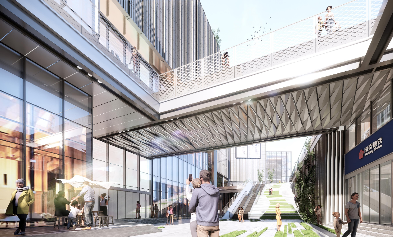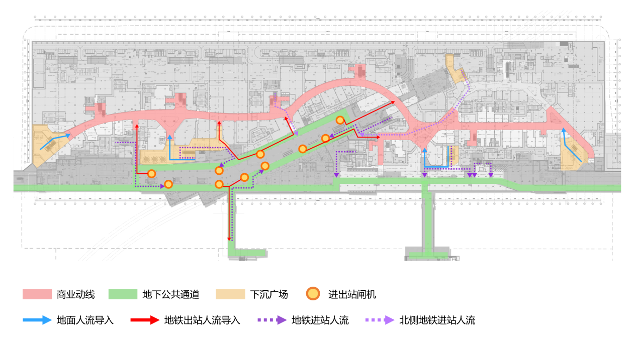 同时,结合地铁出入口,充分利用下沉广场空间,强化沿跑道界面的立体活力空间塑造。