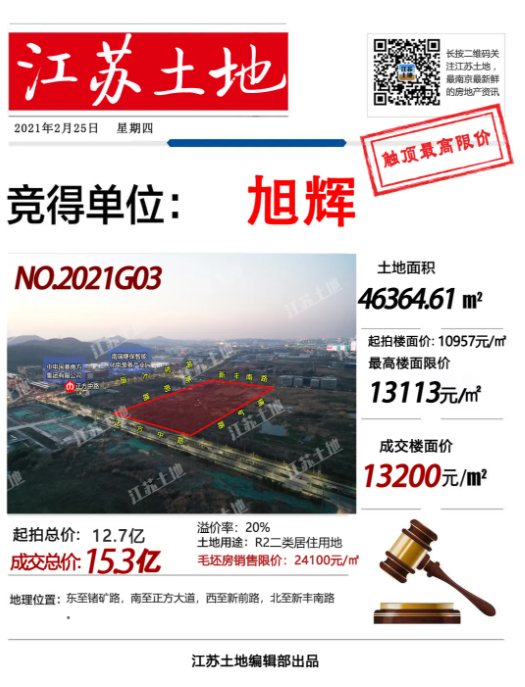 今年2月,旭辉通过摇号拿下该项目,成交总价15.3亿元,成交楼面价13200元/㎡,未来毛坯限价24100元/㎡。