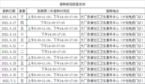 大厂街道社区卫生服务中心6月16日-7月2日接种第二针新冠疫苗时间公示如下。