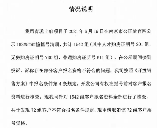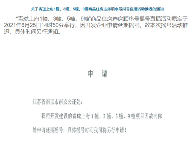 昨日(6月24日),据南京公证处消息,“青珑上府1幢、3幢、5幢、9幢”商品住房选房顺序号摇号直播活动原定于2021年6月25日14时50分举行,因开发企业申请延期摇号,故本次摇号活动推迟,具体时间另行通知。