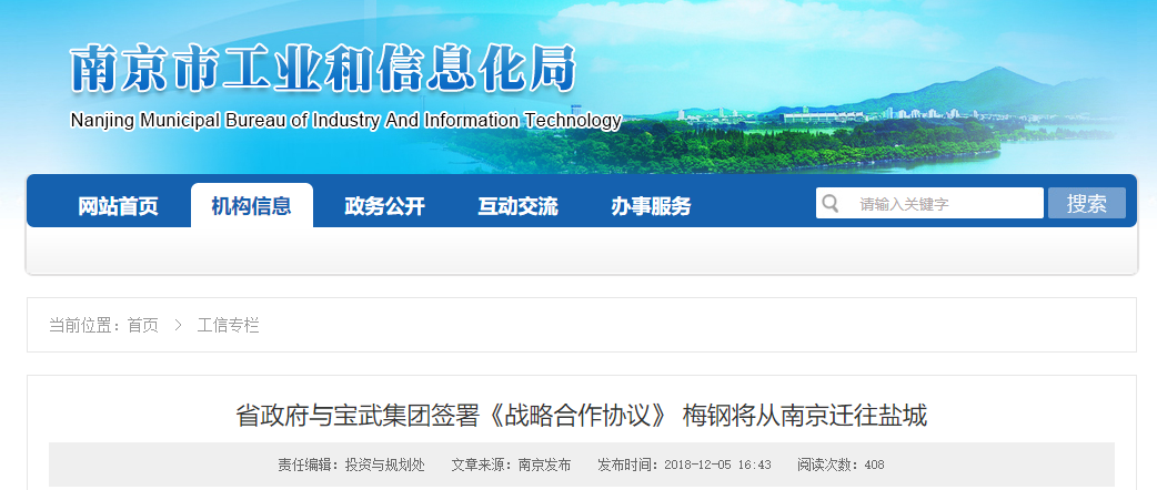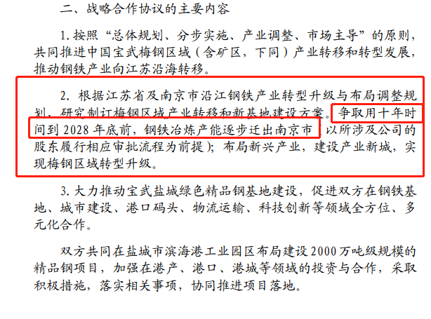 2018年12月1日,宝山钢铁发布公告称,已与江苏省、南京市、盐城市政府签订了《战略合作协议》,推动钢铁产业向江苏沿海转移,争取用十年时间到2028年底前,将钢铁冶炼产能逐步迁出南京。