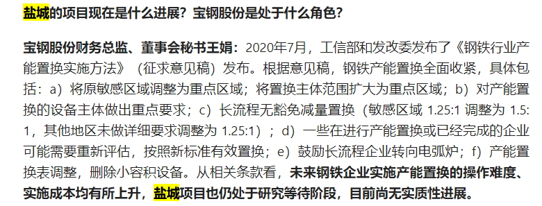 此外,承接梅钢搬迁的盐城项目,按原计划应于2020年下半年开工。去年10月30日,宝钢股份在公告2020年三季度业绩,回答记者问题时表示:原本已经计划开建的盐城项目也仍处于研究等待阶段,目前尚无实质性进展。