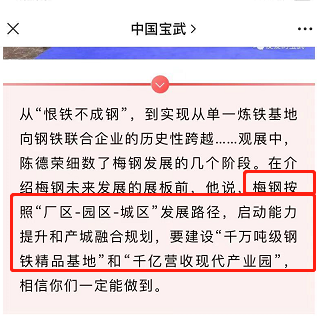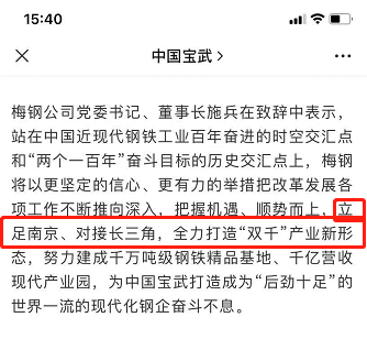 然后5天后(11月23日),宝武钢铁公众号“中国宝武”发布文章,引发轩然大波。文中罕见地出现了梅钢“立足南京""千万吨级钢铁精品基地”等字眼。