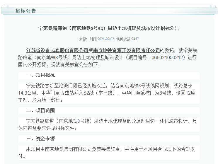 今年2月,南京地铁官网发布宁芜铁路廊道(南京地铁8号线)周边土地梳理及城市设计招标公告显示,宁芜铁路古雄至沧波门段已经实施改迁;中华门至古雄站并入S2线(宁马线);中华门至沧波门为8号线,设置12座车站,均为地下敷设。