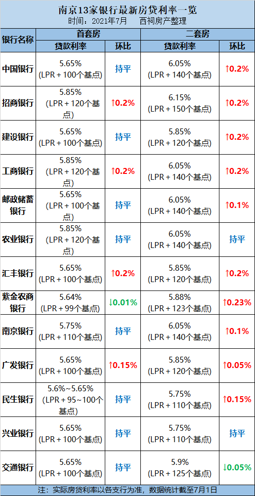 今日(7月1日),西祠房产摸底南京13家主流银行房贷利率发现,南京房贷利率又涨了,各家银行普遍上调了二套房房贷利率,房贷利率已破“6”。