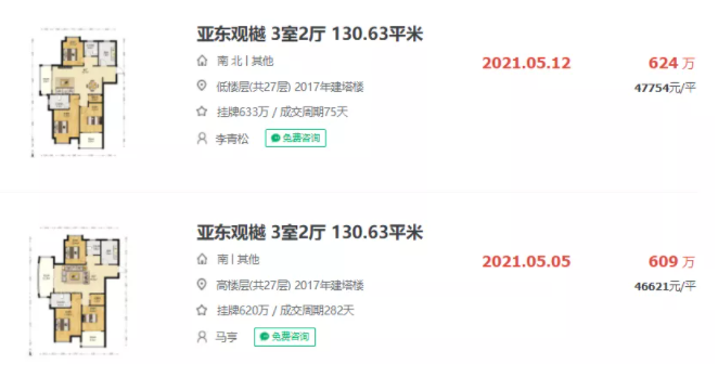 亚东观樾挂牌均价约4.6万/㎡。近日大户型成交价格达到了47754元/㎡,成交总价超600万。