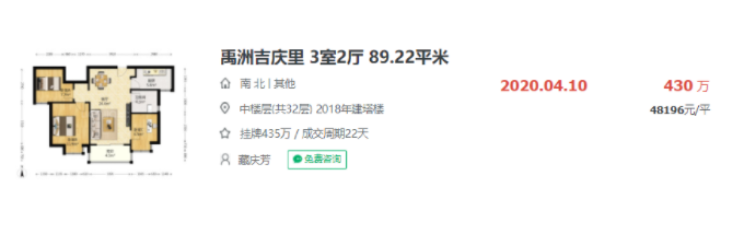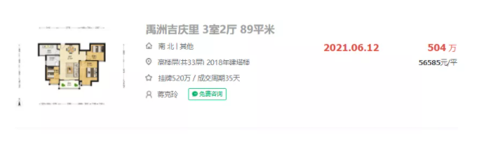 这套禹洲吉庆里成交的二手房为3室2厅,户型建筑面积约89㎡,挂牌仅35天,就以504万的高价成交,单价为56585元/㎡。