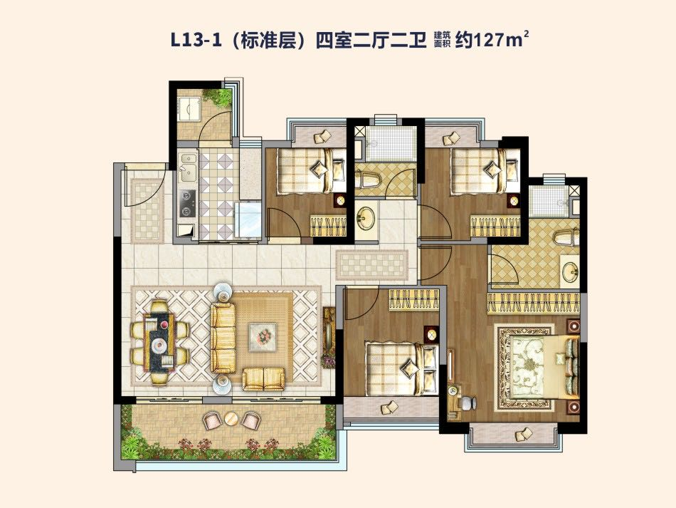 约127㎡四室两厅两卫,顺应三胎时代潮流,让每个孩子都能拥有自己的私密空间。