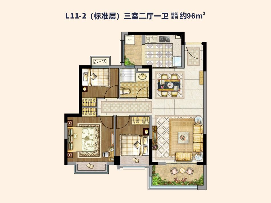 约96㎡的三室两厅一卫,户型方正,双阳台设计,超大客厅给家人提供更多互动与交流的空间。