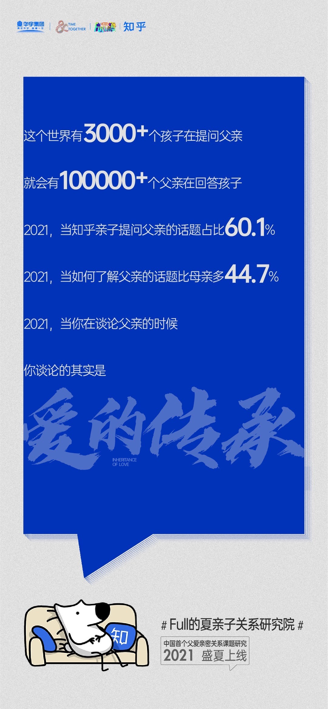 为了解答这个时代的困惑,深入挖掘父亲这个“最熟悉的陌生人”。在长达2年多的时间,深入30座城市抽取华宇近50万业主家庭样本及知乎100万用户样本调研后;2021年华宇集团联合中国最大的知识提问平台“知乎”,成立“FULL的夏亲子关系研究院”;并于7月12日正式上线。
