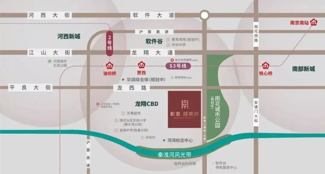 项目近邻河西新城、软件谷、南部新城等地铁S3号线四站南京南站,交通便利。周边有中海城南公馆、龙湖天钜。