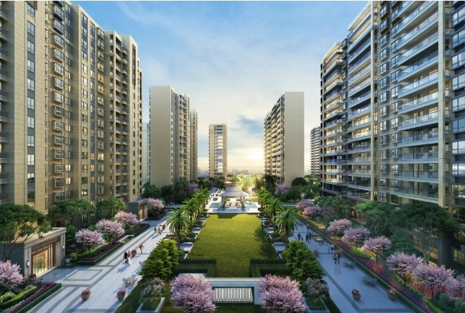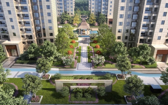 项目沿景观十字轴分布,共建有20幢仅18层高的住宅,户户采光、视野俱佳,不仅居住舒适度高,得房率更是达到82%,远超同类项目。从外立面来看采用局部干挂石材和真石漆,整体为新古典建筑,让人耳目一新。