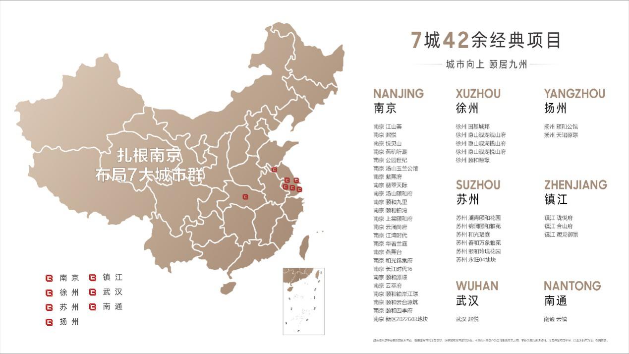 颐居建设立足“1+6+X”的发展战略,以南京为中心城 市,布局苏州、扬州、南通、无锡、徐州、合肥,同时关注常州、杭州等城市,持续深耕发展“扬子江城市群”“宁镇扬一体化”和高铁节点枢纽的核心地带。自成立以来,规模迅速拓展,共计获取14个项目,项目由最初28个拓展至42个,开发足迹遍布南京、苏州、徐州、扬州等7座城市,总建筑面积约862万平方米,总货值约1602亿元。选择城市优质资源,与城市规划相契合,为数万家庭精心筑就幸福理想家园。