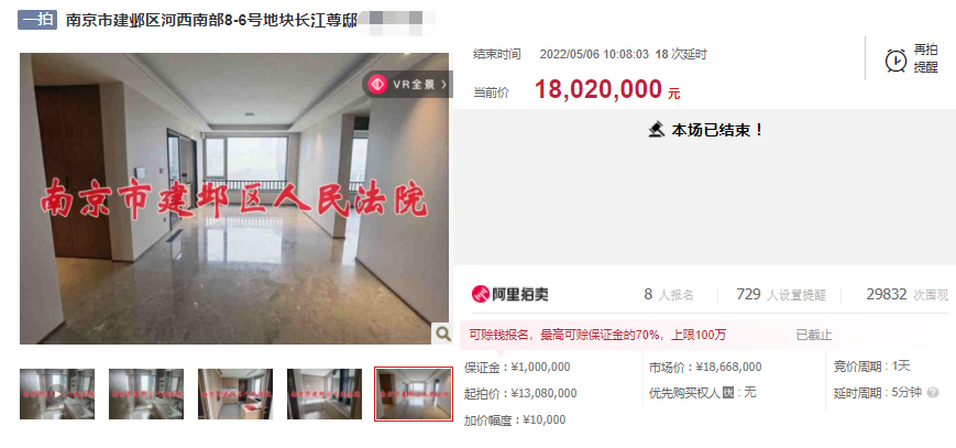今年5月的一次司法拍卖中,葛洲坝南京中国府230㎡的大户型以总价1802万元、成交单价将近8万/㎡。