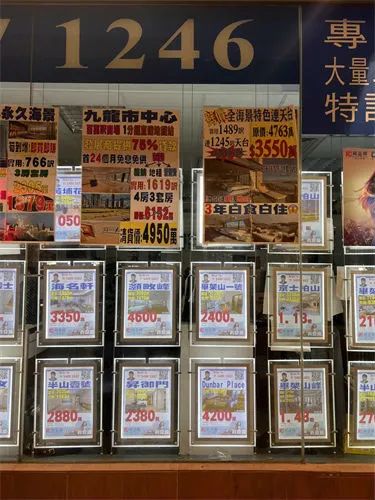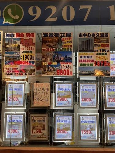 9月14日,香港地产中介窗口上张贴的二手房海报,不少都标出了“劈价”“清货价”等字样。(受访者供图)
