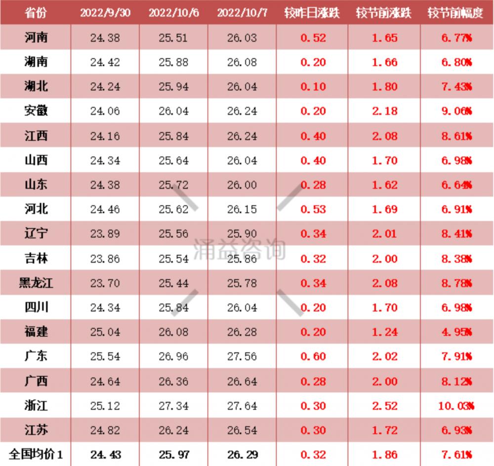 根据涌益咨询数据,10月7日,全国生猪平均价格为26.29元/公斤,较国庆节前(24.43元/公斤)上涨1.86元/公斤,全国多个省份涨幅均超过8%,其中浙江地区涨幅达到10.03%。