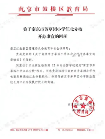 近日,一份关于“关于南京市芳草园小学江北分校开办事宜的回函”的文件流出,文件显示:鼓楼名校芳小分校落地江北,与本部是同一个校长!