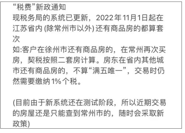 去年11月就又信号,江苏省内曝出“税费”新政:税务系统更新,省内购房信息将联网,2022年11月1日起在江苏省内(除常州市以外)还有商品房的都算套次。