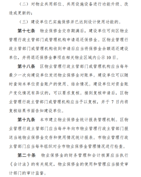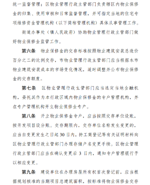 5、此次新政是为保障物业在保修期内的正常使用和维修,进一步方便广大业主申请使用物业保修金,推动物业保修金使用制度落实。