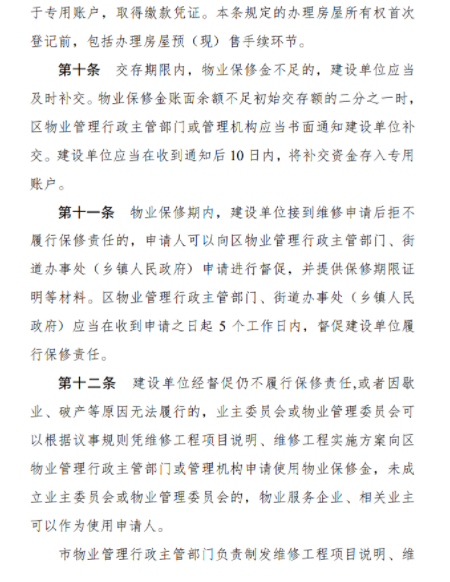 该办法规定,当建设单位在拒不履行质保期内保修责任的情况下,为维护业主合法权益,申请人(业主自治组织、物业服务企业或相关业主)可以向区住建局申请动用该专项资金,保障住宅物业在保修期内的正常使用和维修。