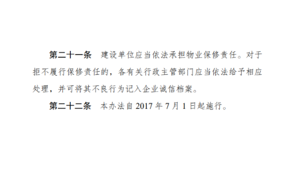 换句话说,在保修期限内,开发商对于这笔“物业保修金”需要负责到底。没有按规定交纳保修金、履行保修责任、按时足额补存的,都将记入信用档案。
