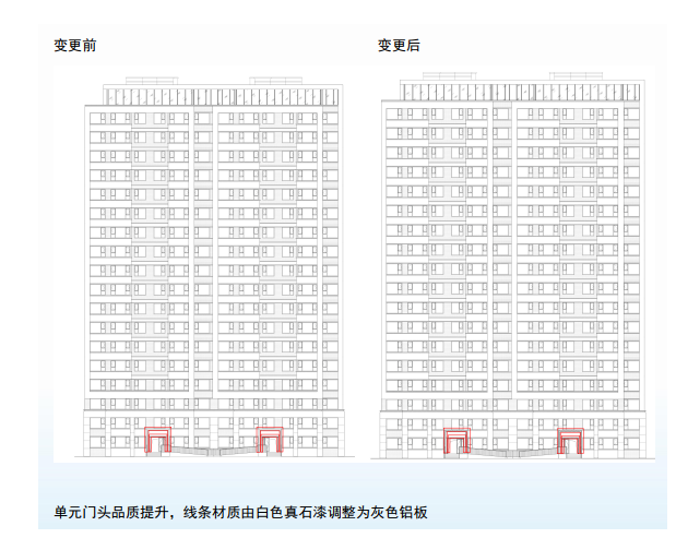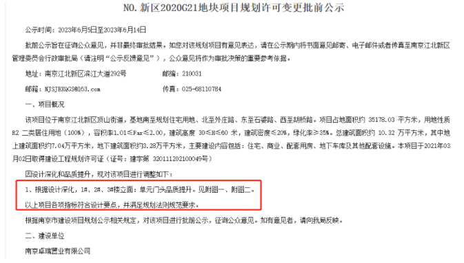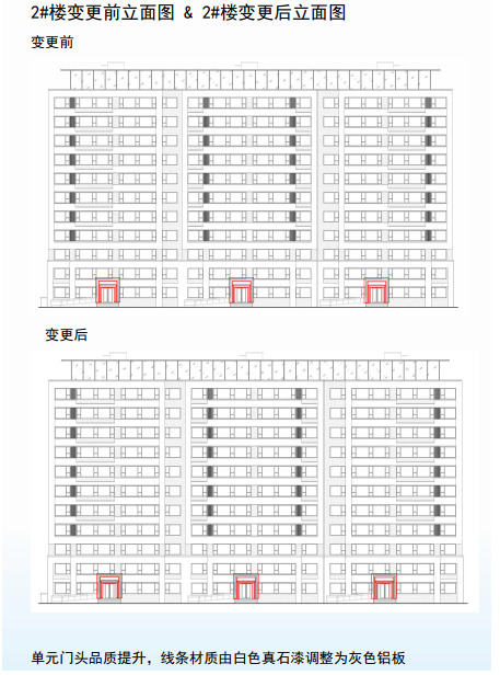 近日(6月5日),江北新区管委会官网发布《NO.新区2020G21地块项目规划许可变更批前公示》,根据设计深化,1#、2#、3#楼立面:单元门头品质提升,线条材质由白色真石漆调整为灰色铝板。