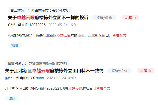 今年5月,有多位网友在领导留言板上反映,该项目楼栋外立面不一致的情形,网友表示:“只有五号楼进户门厅外立面是干挂铝板的,其他楼栋进户门厅外立面是真石漆,与开发商初始规划设计不一致。”