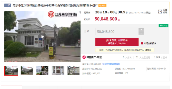 该套房源拍卖时间为2023年7月13日10时至2023年7月14日10时止,竞拍需交纳保证金300万元,加价幅度为5万元。
