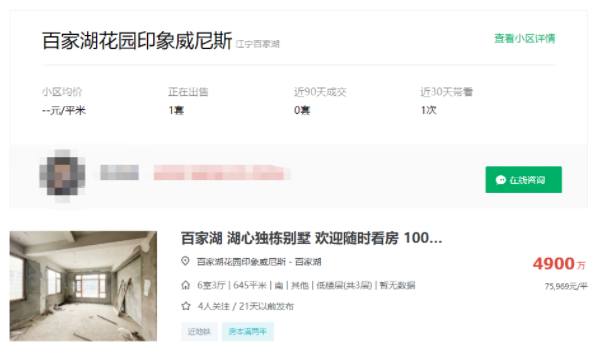 目前,该小区在链家上仅有一套房源挂牌在售,挂牌总价为4900万,挂牌单价为75969元/㎡。