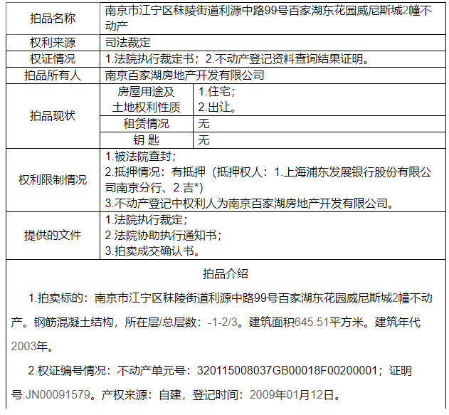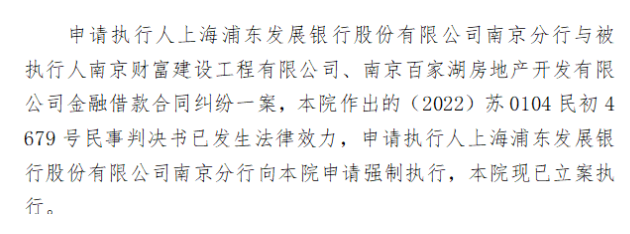 据裁判文书显示,因金融借款合同纠纷,申请执行人上海浦东发展银行向法院申请强制执行,南京百家湖房地产开发有限公司名下的上述房产被拍卖。