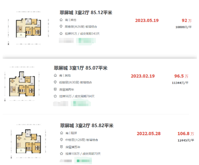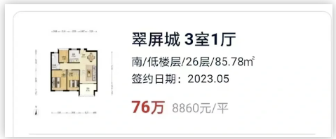 近期,昔日摇号神盘翠屏城,一套建面约85.78㎡三房,以76万成交,单价8860元/㎡,刷新了该小区小户型成交单价新低。