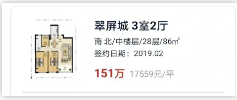 犹记四年前(2019年1月),翠屏城上演8K+人摇号的“高光时刻”!一个月后,一套约86㎡三房以151万成交,单价高达17559元/㎡,创下小户型新高。