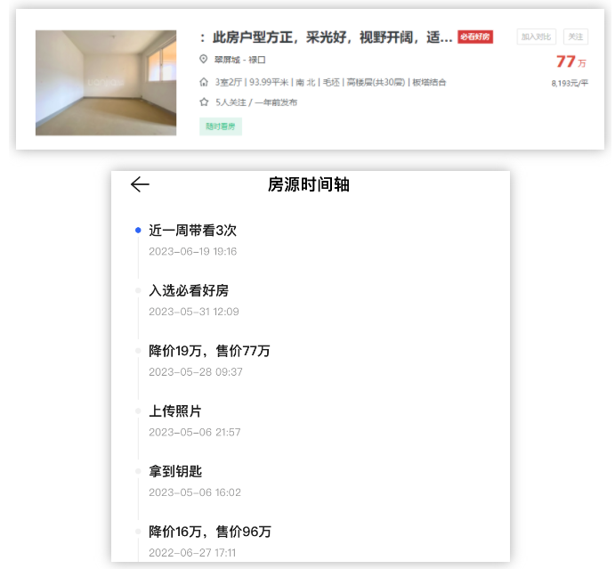 据链家显示,一套建面约94㎡毛坯高层房源,今年5月28日猛降19万,调至77万,挂牌单价仅8103元/㎡,近30日带看10次,至今仍未成交。