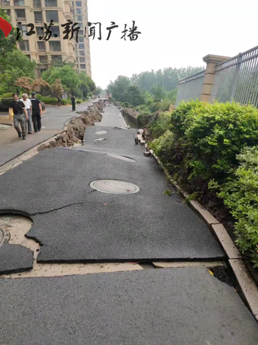 去年夏天的一场暴雨还直接将小区的围墙、道路冲塌。据媒体报道,小区东北侧的路面大概有100多米完全地坍塌,落差达到两米左右,围墙也完全地倒塌了。