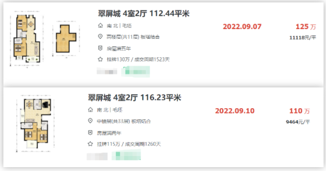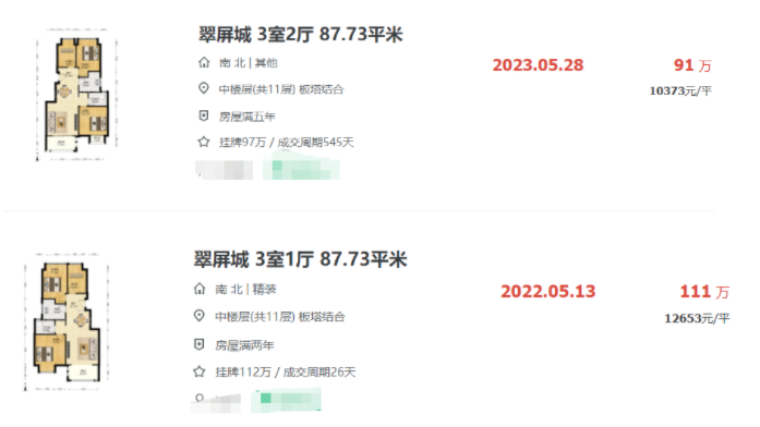 而今年4-5月间,翠屏城接连成交的建面约118㎡四房,成交单价均降到了“8”字头。