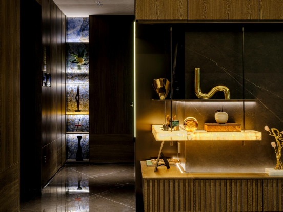 隐藏式的户内门设计,几乎没有纹理差异的进口天然大理石地面,再加上顶面的不围合主义,最大化体现了建面约143㎡户型空间宽广的尺度感。大面积木饰面搭配格调壁龛,背衬甄选“景泰蓝”岩板,与发光云石层板搭配组合,让照明也成为了一种幸福感的蔓延。打开镜柜更是令人眼前一亮的收纳设计,连吹风机的插座位置都贴心考虑好了,如此无可挑剔的储物收纳,不心动都难吧。