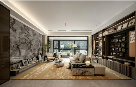 客厅部分,采用了主流的无主灯设计。背景墙岩板采用金冰玉样式拼接,整体色调也具备雅奢质感,酒店度假风十足。