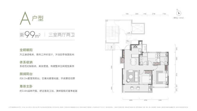年轻置业者的最爱,户型方正通透,南向三开间设计,约6.2m双开间阳台,全景落地窗;两个卫生间,厨房岛台,S墙设计,小户型也可容纳双门或十字开门冰箱。