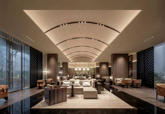 约8米的高旷空间,黑白交错的地面纹路,亚马逊绿奢石、灯饰、格栅的点缀,无处不彰显艺术品味和格调,奢级酒店既视感!