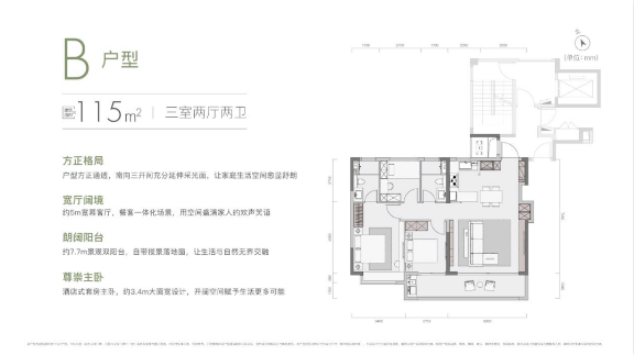建面约115㎡户型,整体格局与建面约99㎡一致,但空间格局更大!带有约7.7米双阳台、约5米超大横厅,有序安放生活的自在从容。