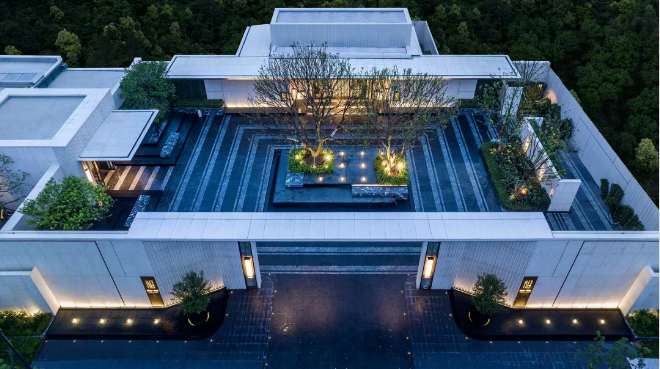 进深约20米的环游式泊车空间,落客庭院配合中庭宽幕水景,归家=度假的开始。