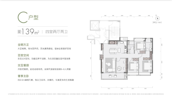 建面约139㎡为雨核主流深改户型,拥有4个房间的同时,还拥有约6.4m的双开间阳台和约3.7m开间的客厅,厨房拥有独立岛台。