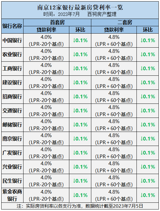 今日,西祠房产摸底南京12家主流银行发现,目前首套房主流房贷利率为4%(LPR-20个基点),二套房主流房贷利率为4.8%(LPR+60基点),和上月相比,南京首套房、二手房利率同步下调了10个基点。