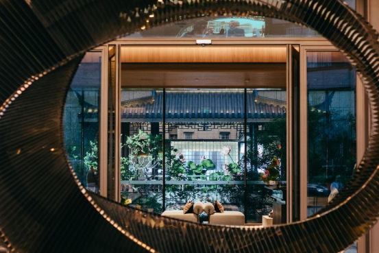 设计师研读瞻园的空间围合布局,借鉴开与合的对比手法营造“小中见大”的艺术效果,以对称式布局、“对望”格局”,透过精致挂落,让古建景观亭与现代建筑框景展开跨越时空的对话。古建景观亭运用现代材料重现「扇亭飞檐」,飞檐翘角形如飞鸟展翅,翩若惊鸿传续千年,层叠的建筑屋顶出檐深远别具韵味;传承六朝的古法手艺,将「莲花纹瓦当」庄重排列于屋檐前端,将「篆书」刻画于扇亭屋檐两侧,古今交融打造一处东方都会美学艺术空间。