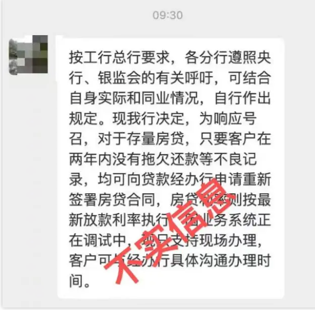 7月17日,网传工行存量房贷客户只要两年内没有拖欠还款等不良记录,均可向贷款经办行申请重新签署房贷合同,房贷利率按最新放款利率执行。当晚工行出面辟谣,表示市场相关信息并非工行对外发送,目前没有接到总行开展这一业务的通知,因此并没有具体办理渠道,客户可以关注公众号和网络,也可以咨询贷款经办支行。