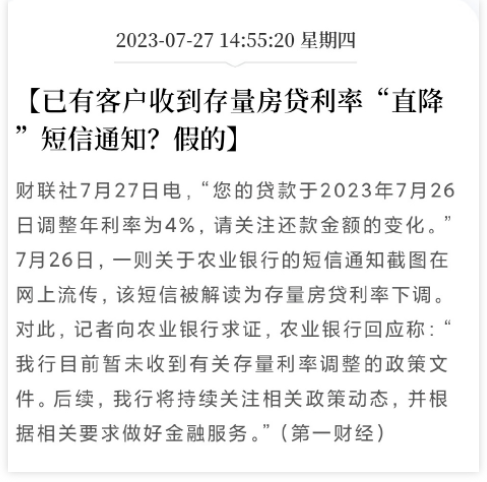 “您的贷款于2023年7月26日调整年利率为4%,请关注还款金额的变化。”7月26日,一则关于农业银行的短信通知截图在网上流传,该短信被解读为存量房贷利率下调。