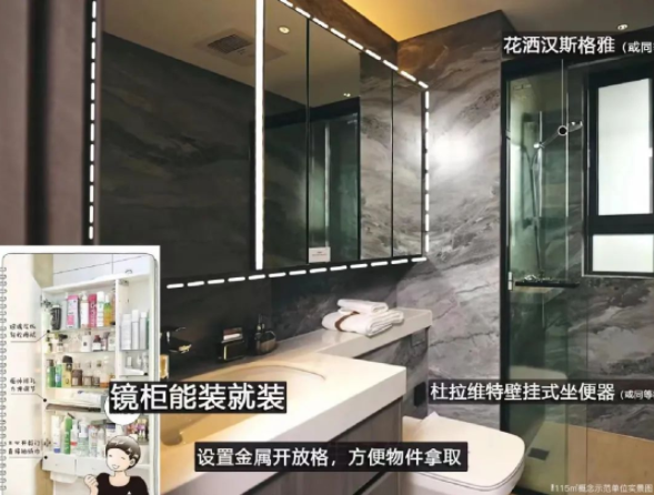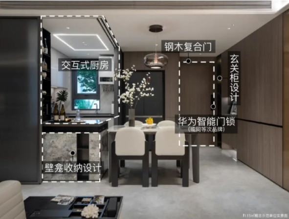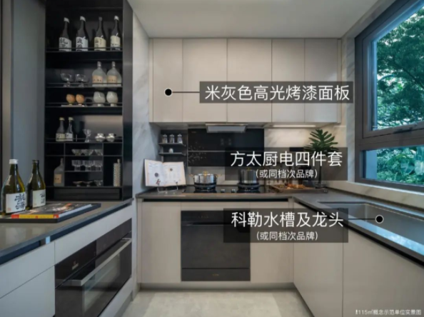 精装方面,入户门采用钢木复合门,搭配华为智能门锁。三大件方面,项目配备了大金的中央空调,博世的地暖,还有朗思威的新风系统。厨房配备了方太的灶具、油烟机、洗碗机、蒸烤一体机以及科勒的水槽和龙头,还有斯麦格的垃圾处理器。主卫配备了酒店式的通长镜柜+美妆冰箱、杜拉维特的智能马桶、汉斯格雅的花洒、龙头、杜拉维特的台盆(实际以交付为准)。