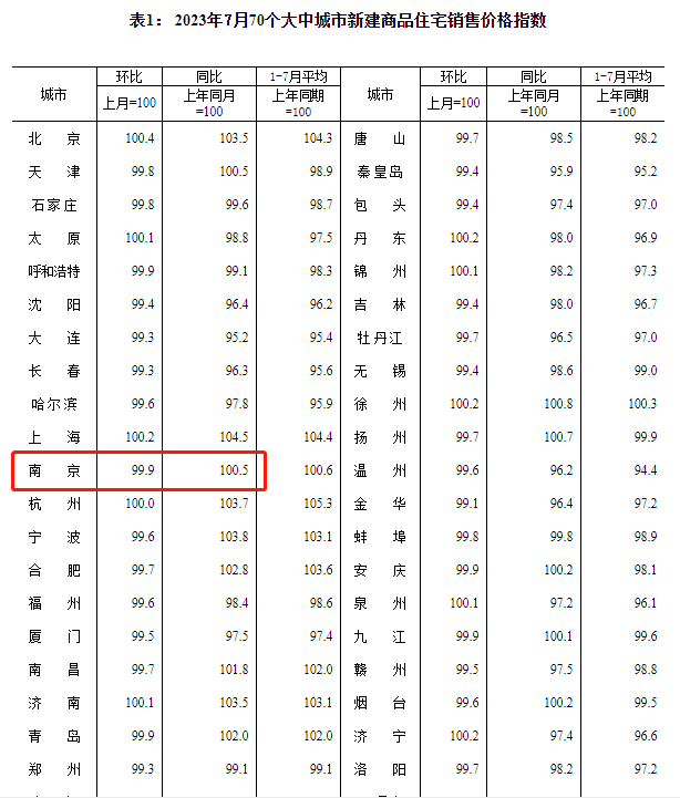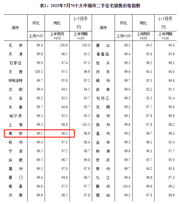 8月16日,国家统计局发布2023年7月全国70城住宅销售价格报告。7月南京新房价格环比下跌0.1%,同比上涨0.5%;二手房价格环比下跌0.9%,同比下跌1.7%。