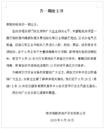 今年6月底,业主们又一次收到延期通知,开发商表示,由于6月正处于大量楼盘集中交付期,致使相关验收流程较长,原定于6月30日交付日期现已不具备交付条件。根据目前进展判断,所有验收手续完成还需约15天时间可满足交付条件。